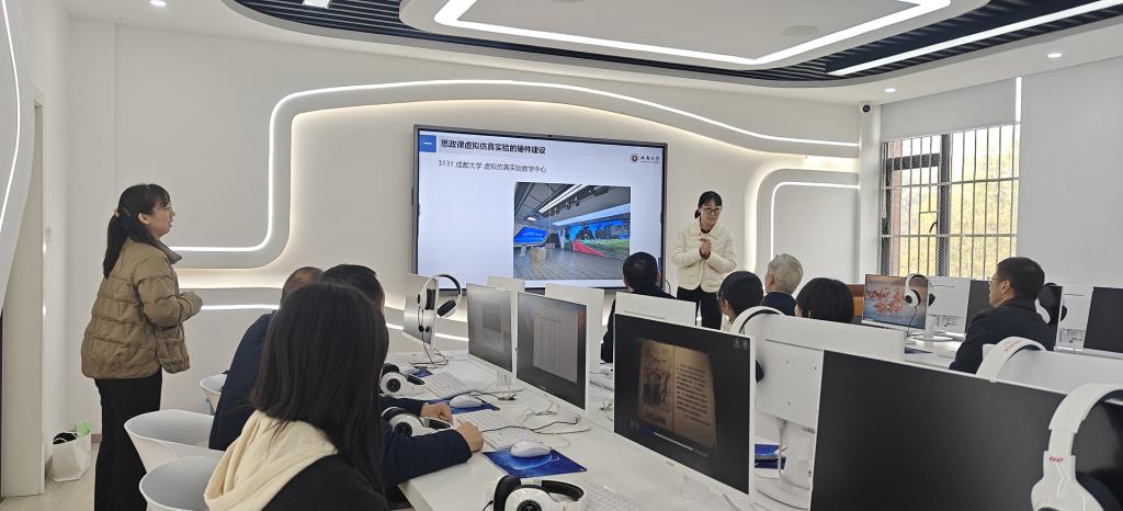 讲座结束石书臣教授、香蕉视频 附属中学老师参观了学院虚拟仿真实验室。“毛泽东思想和中国特色社会主义理论体系概论”“习近平新时代中国特色社会主义思想概论”教研室主任侯幸博士对《公园城市——习近平生态文明思想的成都实践》虚拟仿真课程作了较为详细的介绍。石教授对实验室建设成果给予高度评价,他说现代信息技术与思想政治理论课教学的深度融合是思政课教学改革的重要方向,通过现代信息技术将抽象的理论转化为可感知、可参与的沉浸式体验,符合当代大学生的学习特点和认知规律。在交流中,石教授就如何加强虚拟仿真课程建设、如何用好虚拟仿真实验室、将教学资源惠及更多师生,如何提升思政课教学实效性等问题与大家进行了深入交流并提供了专业指导。